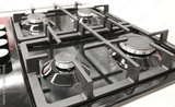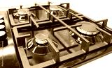 New modern gas stove with four burners for the kitchen, black enamelled surface, cast iron grilles