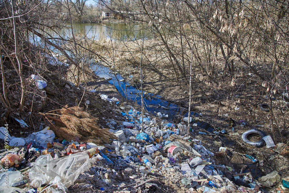 Garbage thrown to the bank of the river, the topic of environmental pollution