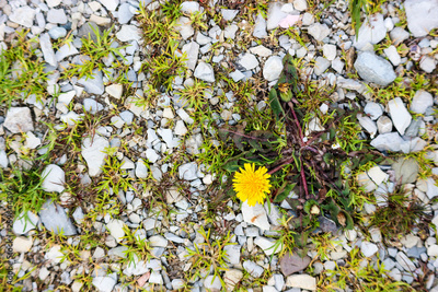 spring lone dandelion on the stones closeup