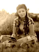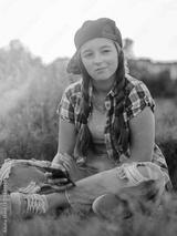 girl teenager in glasses sits the ground city background in the headphones of selfie smartphone