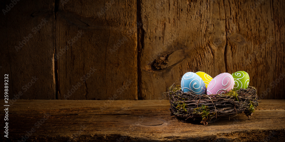 Colorful painted happy easter eggs in birds nest basket on rustic wooden old panorama background copy space