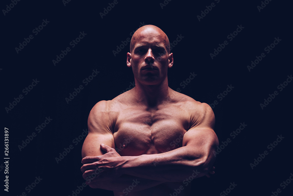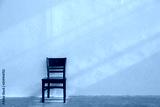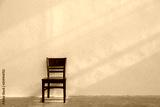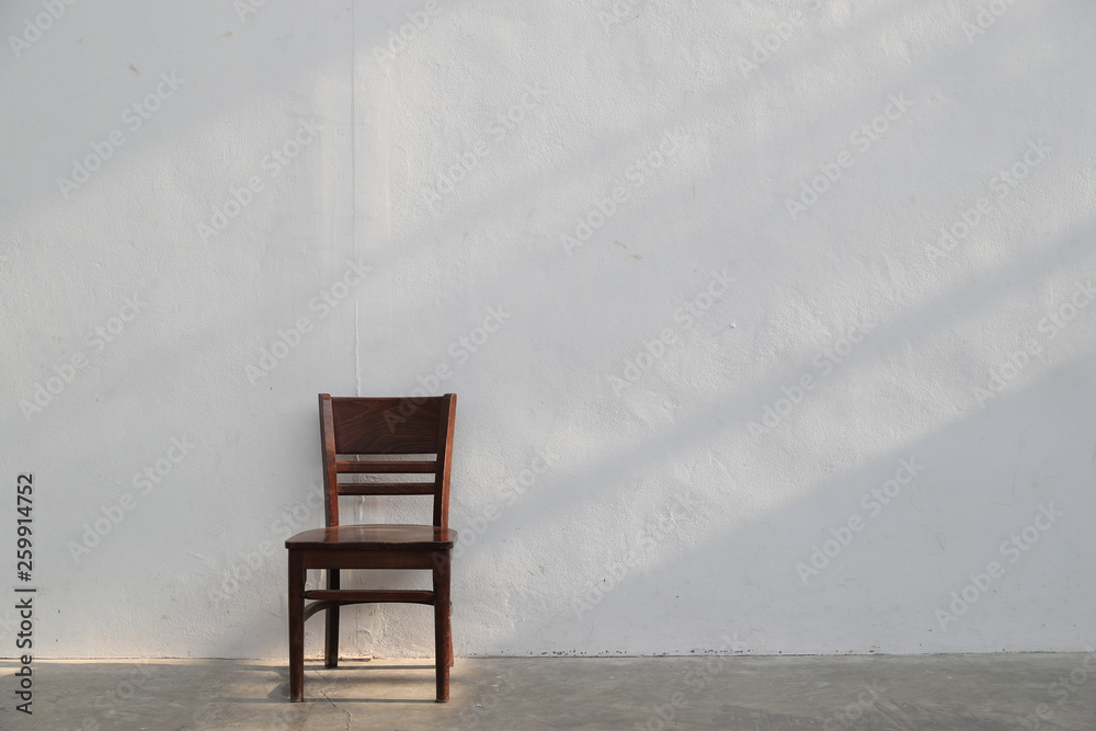 single brown wooden chair with light ray from window on white wall background.