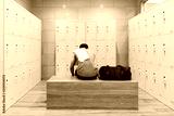 man with towel sitting on wooden bench in gym - prepare for workout.