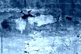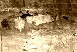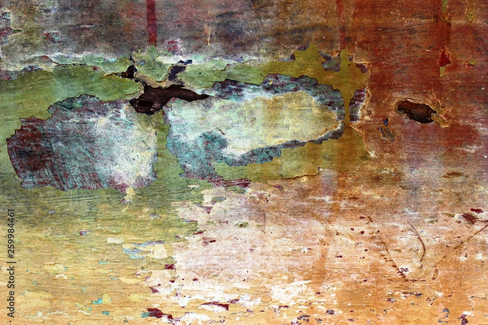 Abstract textured background of an old decaying wooden boat hull with mostly red and orange color peeling paint.