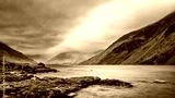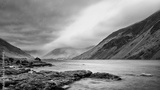 Stunning long exposure landscape image of Wast Water in UK Lake District during moody Spring evening in black and white