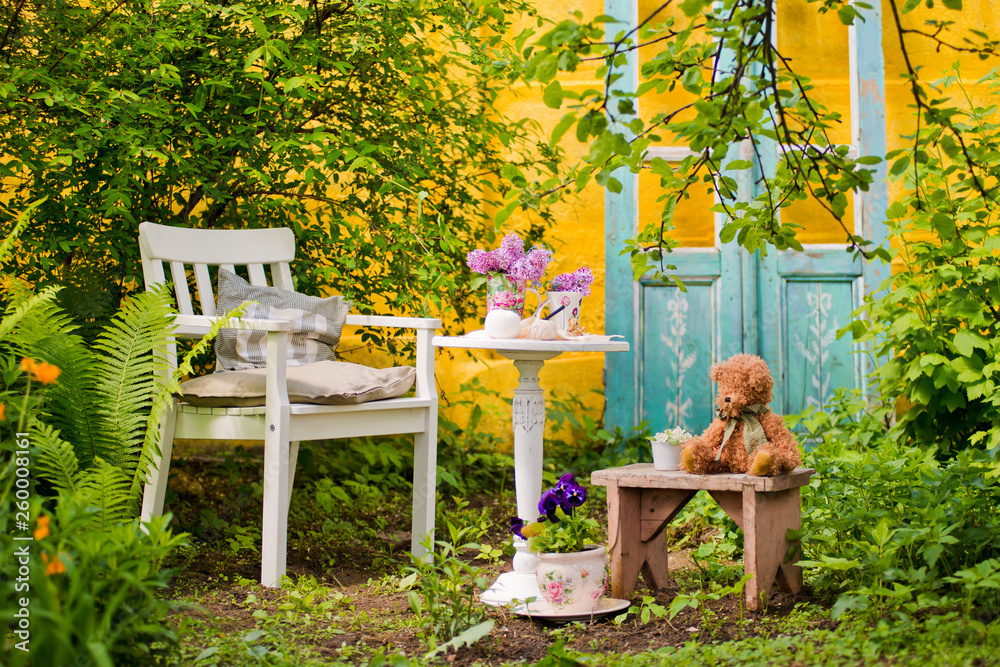 White wooden chair table with a bouquet of lilacs in the spring garden.