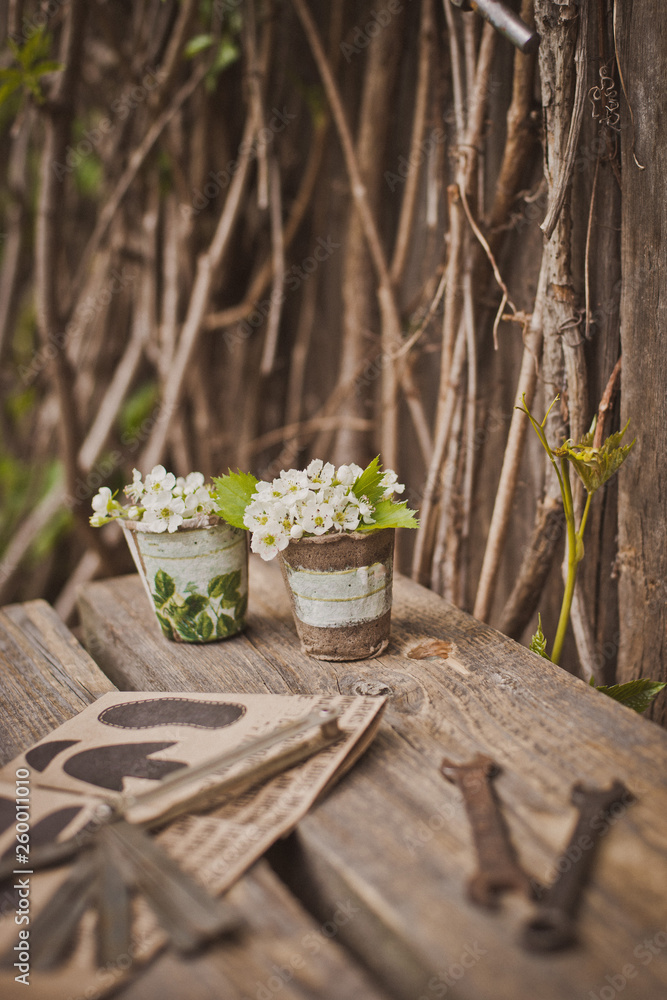 design of the photo zone in a rustic style, old wooden doors and boards with tools and spring flowers.