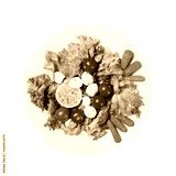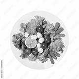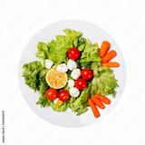 Healthy food. Tasty salad with cherry tomatoes, salad leaves, lemon, spices, carrot and quail eggs isolated on white background.