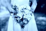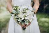 bride in white dress holding a wedding bouquet of flowers and greenery