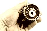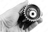 Timing belt gear wheel in the hand above white background.
