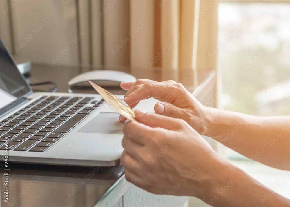 Online shopping purchase or internet bill payment with consumer buyer using credit card paying money via digital communication
