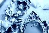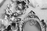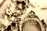 wedding rings lie on a vintage mirror