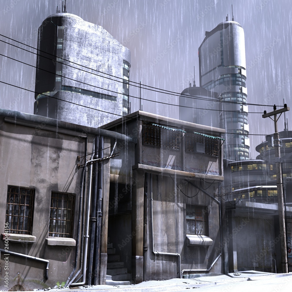 3D illustration of a street in the industrial area. Futuristic cityscape in the fog and rain. Wallpaper in a cyberpunk style.
