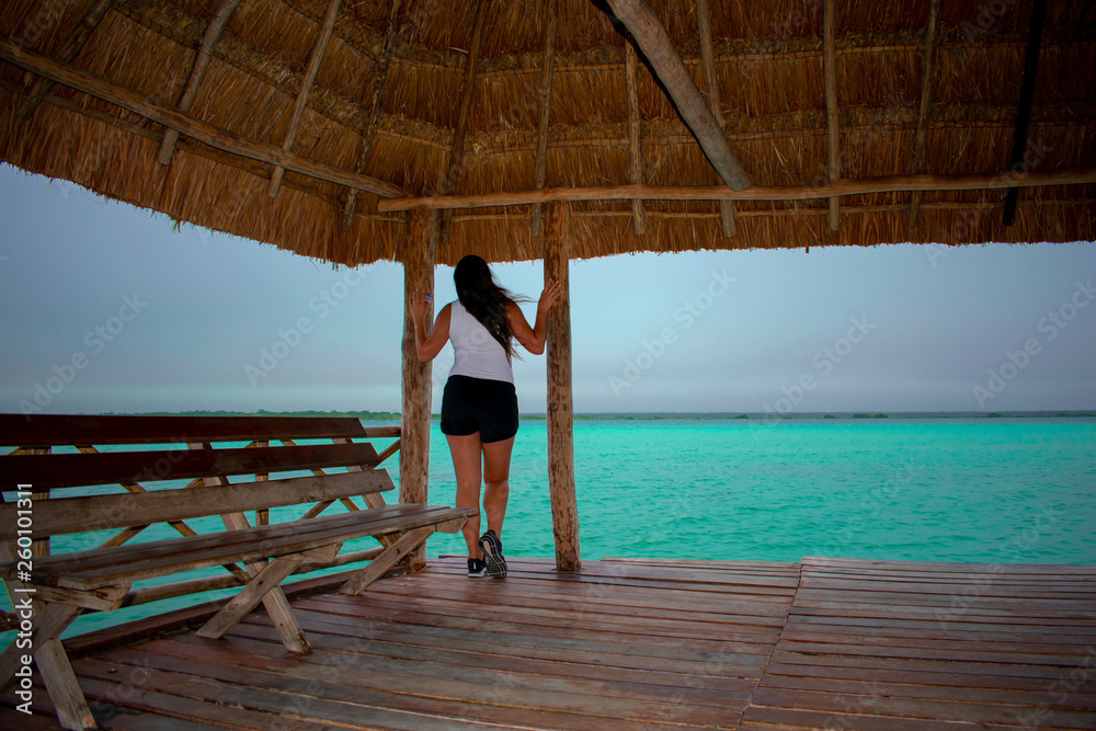 Back view of Young woman standing on wooden bridge on Bacalar Lake, Clear turquoise water in Mexico.