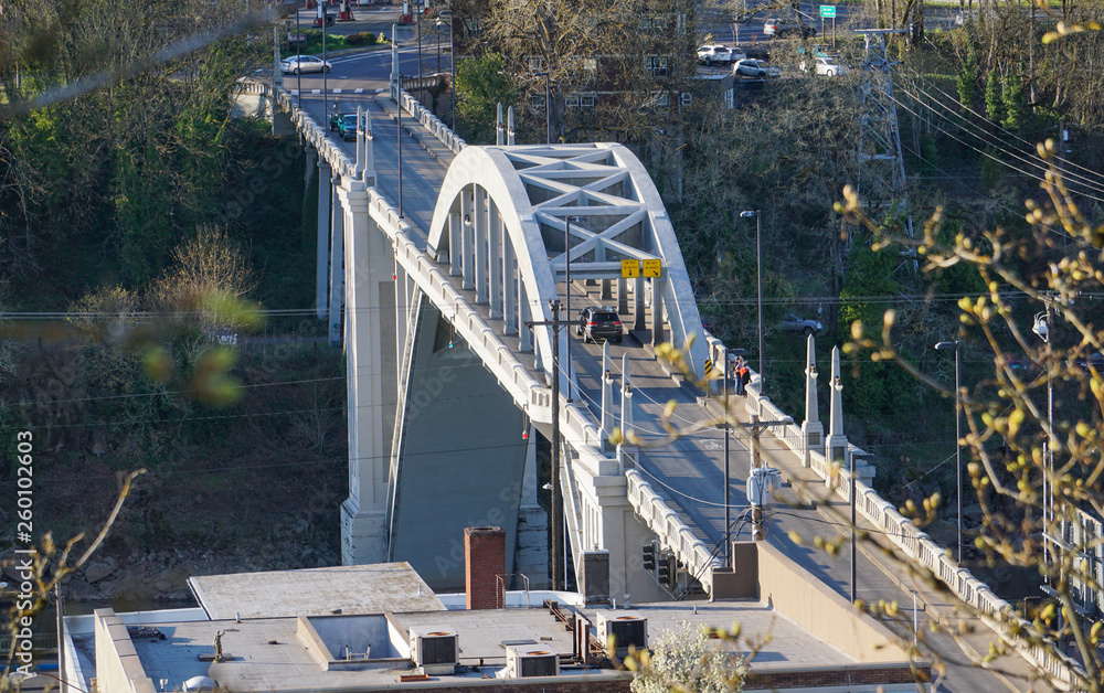 Oregon City Bridge or Arch Bridge, 1922, carries traffic and people across the Willamette River. Steel through arch engineering with sprayed concrete coating in Art Deco architecture style.