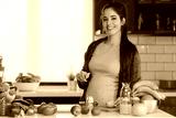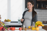 Beautiful smiling young pregnant woman preparing healthy food with lots of fruit and vegetables at home kitchen