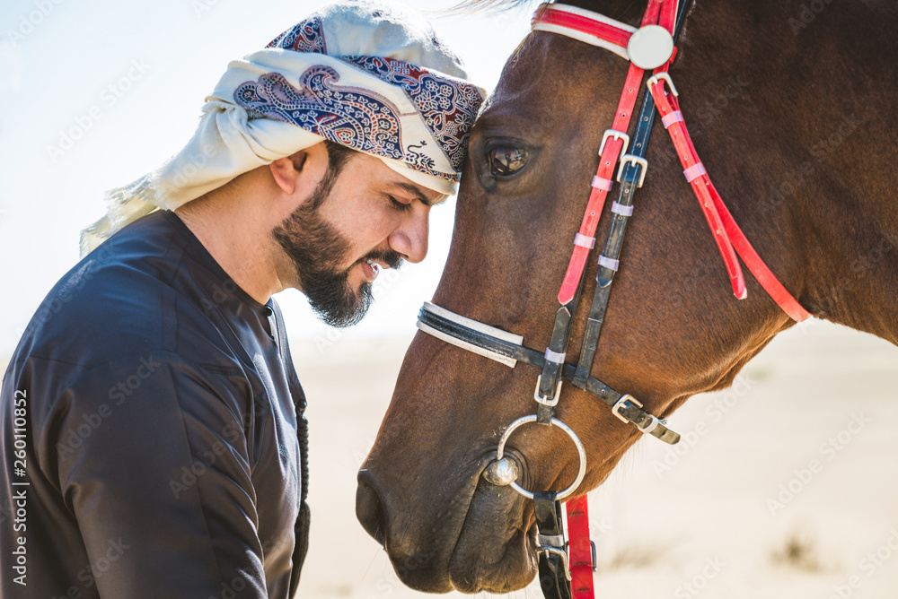Arabian man with horse in the desert