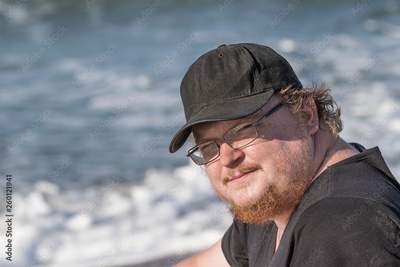 Portrait of a young man with a raw rusty beard dressed in a black shirt and a black cap sitting on the sea shore looking at the camera.