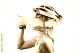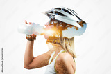 Double exposure woman cyclist. Combined with a nature. Concept Healthy lifestyle in the nature.