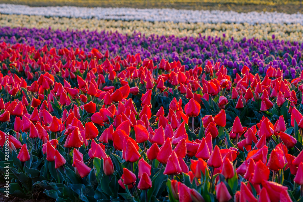 Tulipes rouges, violets, jaunes et blanches sur le champ. Provence, France. Rosée du matin, lever de soleil.