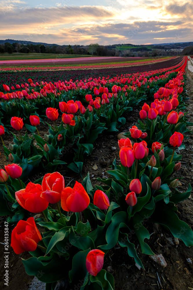 Champ de tulipes en Provence, France. Tulipes rouges au premier plan. Coucher de soleil. Ciel avec de nuages. Photo verticale.
