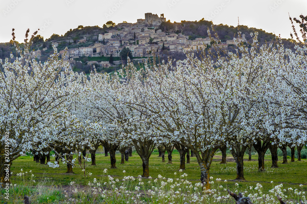 Les cerisiers en fleurs au printemps. Village de Lacoste en arrière plan. Provence, Luberon. France.