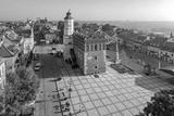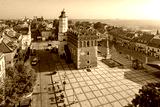 Sandomierz old city, Poland. Aerial view in sunrise light. Gothic city hall with clock tower and Renaissance attic and St Mary statue in the market Square (Rynek). One of the oldest towns in Poland.