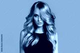 Beautiful woman with long wavy coloring hair. Flat gray background.
