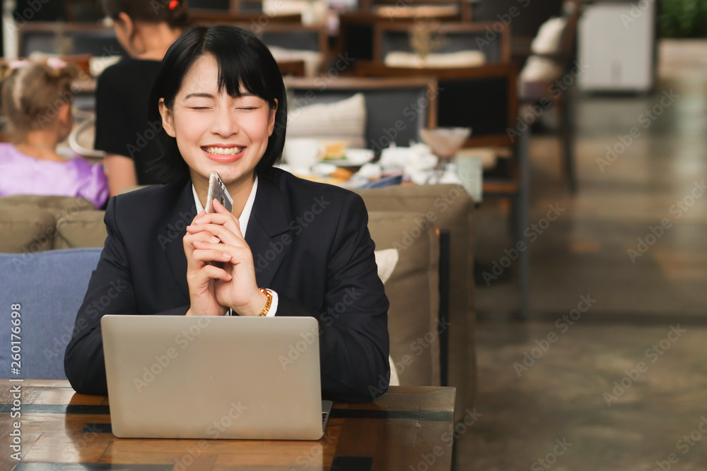 Asian woman using laptop and drinking coffee in coffee shop cafe