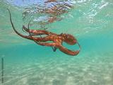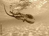 Underwater photo of octopus in tropical turquoise sandy bay with turquoise clear sea