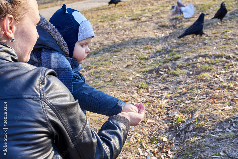 A child takes pumpkin seeds from her mother's hand to feed the birds in the park in early spring