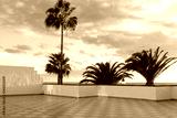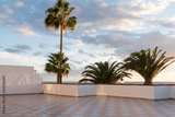 Large tiled sunny villa terrace with palm trees, golden sunset light and a slightly clouded sky.