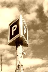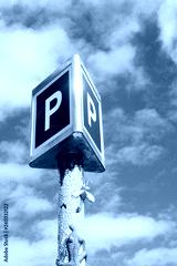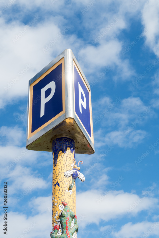 Giant blue P parking sign set against a blue and clouded sky with copy space.