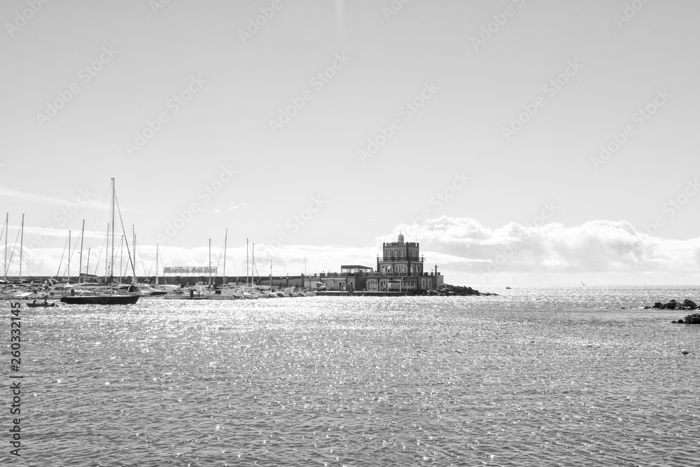 Blue harbormaster house restaurant and view over the beautiful sunny harbour of Marina del Sur in Las Galletas.