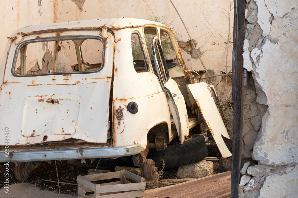 Old white rusty damaged destroyed car left in an old and abandoned garage in the rural countryside of Tenerife.