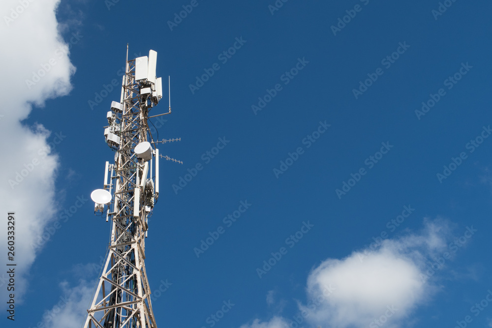 4G and 5G cell site. Base Station or Base Transceiver Station. Wireless Communication Antenna Transmitter. Telecommunication tower with antennas against blue sky.