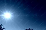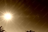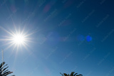Sunflared backlit palm tree crown with sunburst sun and copyspace.