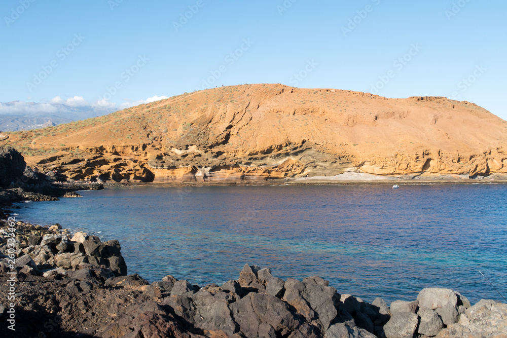 Beautiful seascape landscape and holiday apartments along the coast of El Medano, Costa del Silencio, Tenerife, Spain.
