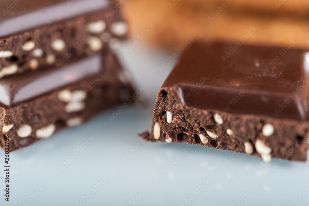 Various shortbread, oat cookies, chocolate chip biscuit and pieces of chocolate with seeds and nuts.