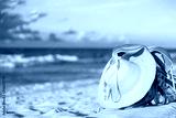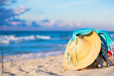 Straw hat and blue bikini bra swimsuit with beach bag against the ocean beach with beautiful blue sky and clouds. Relaxation, vacation idyllic background.