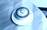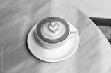 latte or Cappuccino with frothy foam, coffee cup top view on table in cafe.