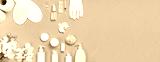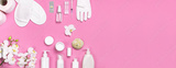 Spa concept cosmetology medicine plastic surgery branding mock-up. White cosmetic bottle gloves slippers hygiene items gasket tampon cotton pads injections tablet orchid on pink background flat lay