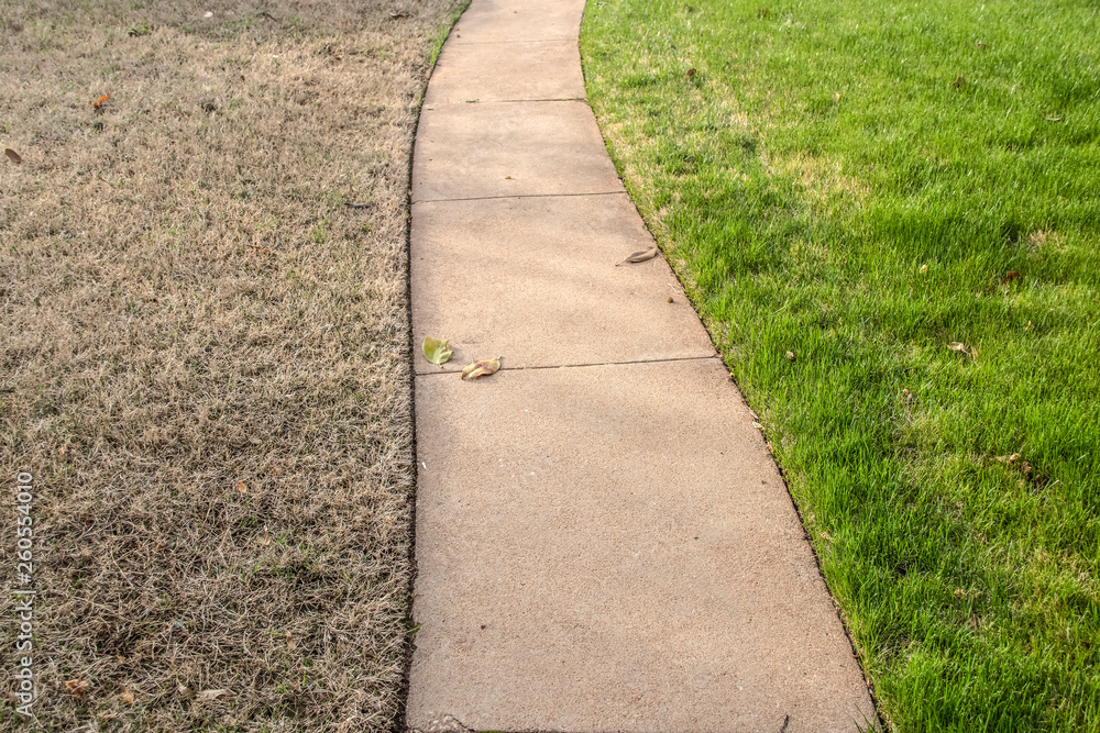 Sidewalk with green fescue on one side and brownish bermuda grass on the other side in the springtime
