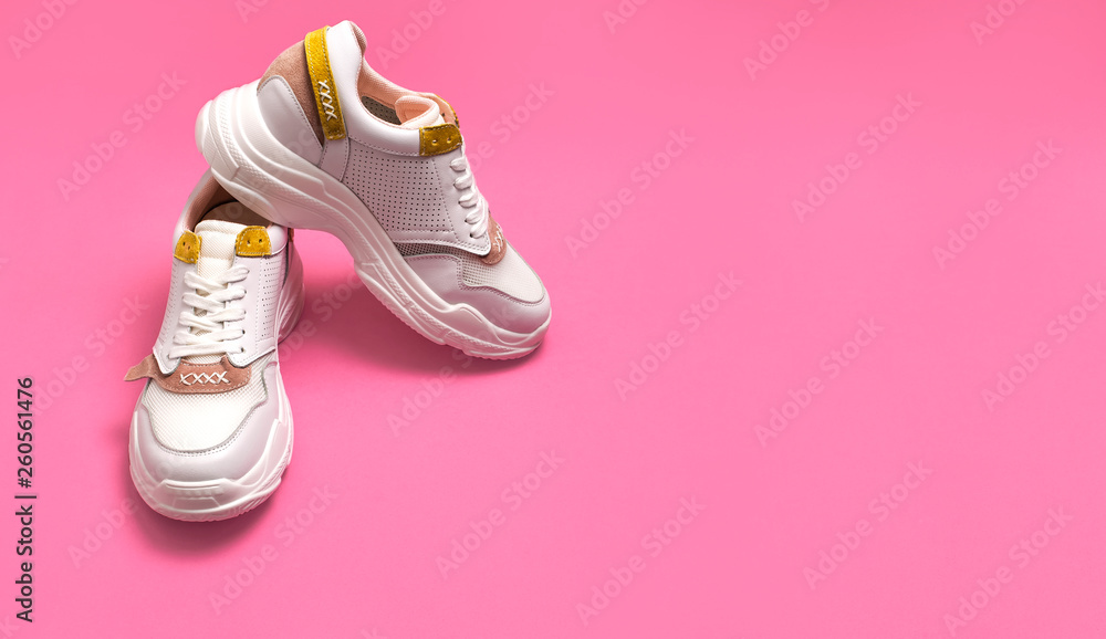 White female sneakers on bright pink background. Fashion blog or magazine concept. Women's shoes, trendy sneakers, fashion, style, lifestyle. Flat lay top view copy space minimal background.