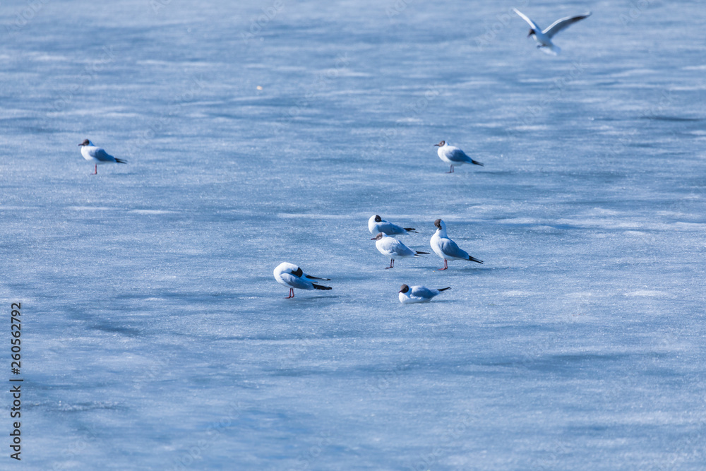 The scene of gulls' market during the mating season on the spring ice of the river or the lake in the city park in the clear sunny day