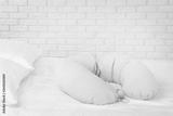 Pink body pillow on white bed