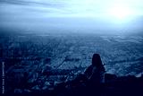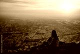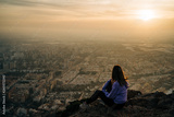 Young woman sitting and using the mobile on the top of the mountain looking at the city from above, during nice sunset