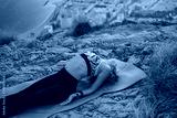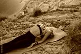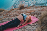 Beautiful young woman doing yoga at the top of the mountain with views from the city during a nice sunset. Freedom and yoga concept.
