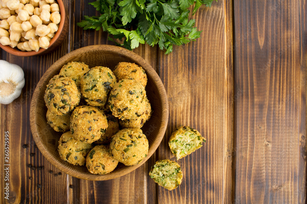 Chickpea falafel in the brown bowl on the wooden background.Top view.Copy space.