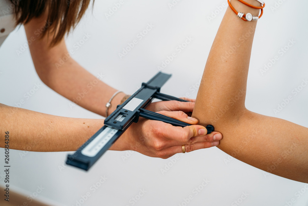 Doctor taking patient's body fat measurements on arms with fat caliper